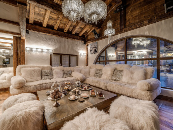 The chalet is designed for entertaining. A private après-ski bar sets the tone, while multiple lounge spaces allow the atmosphere to shift from relaxed to lively as the evening unfolds. Below, a wine cellar and fromagerie offer a more intimate setting for tastings, adding another layer to the experience.