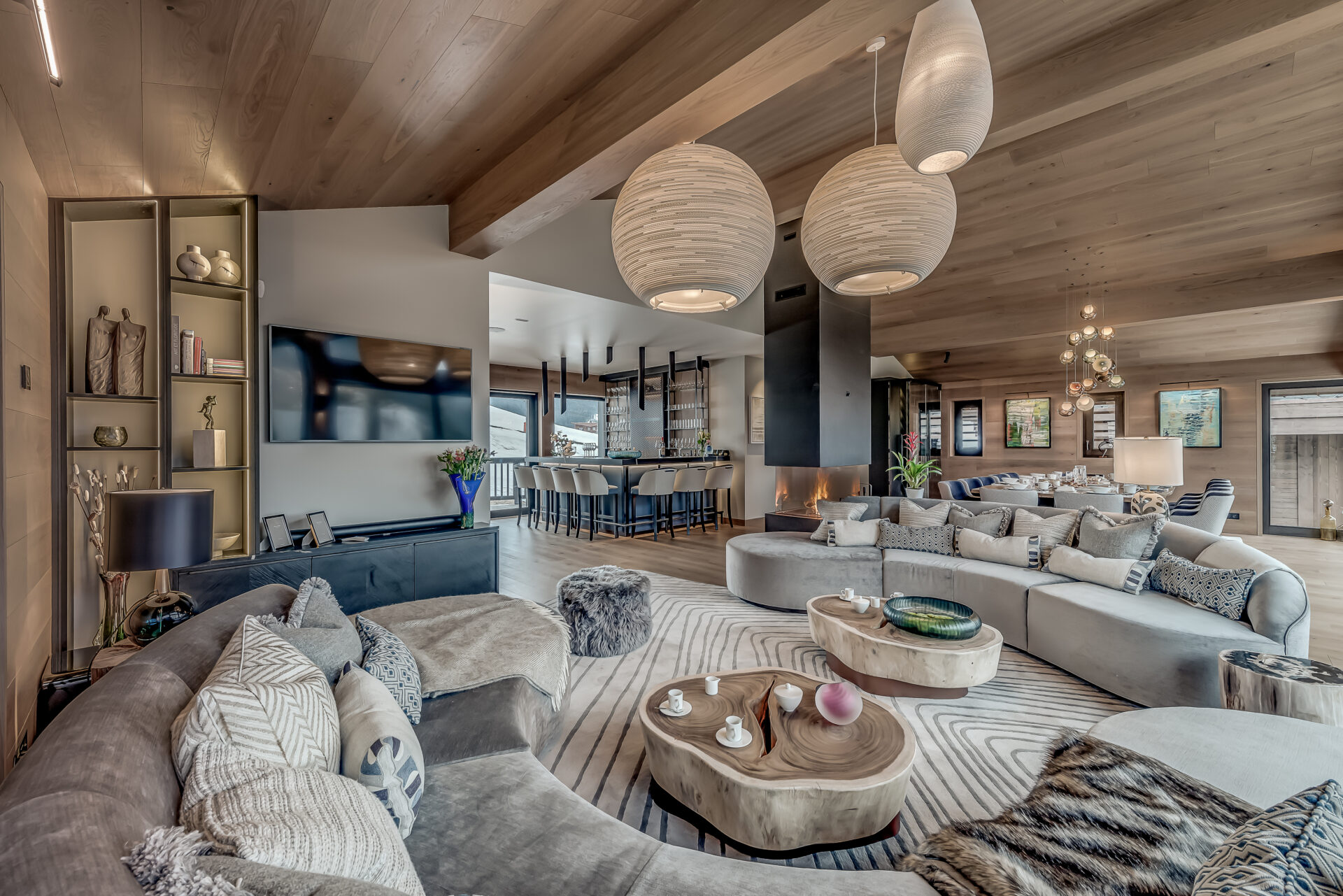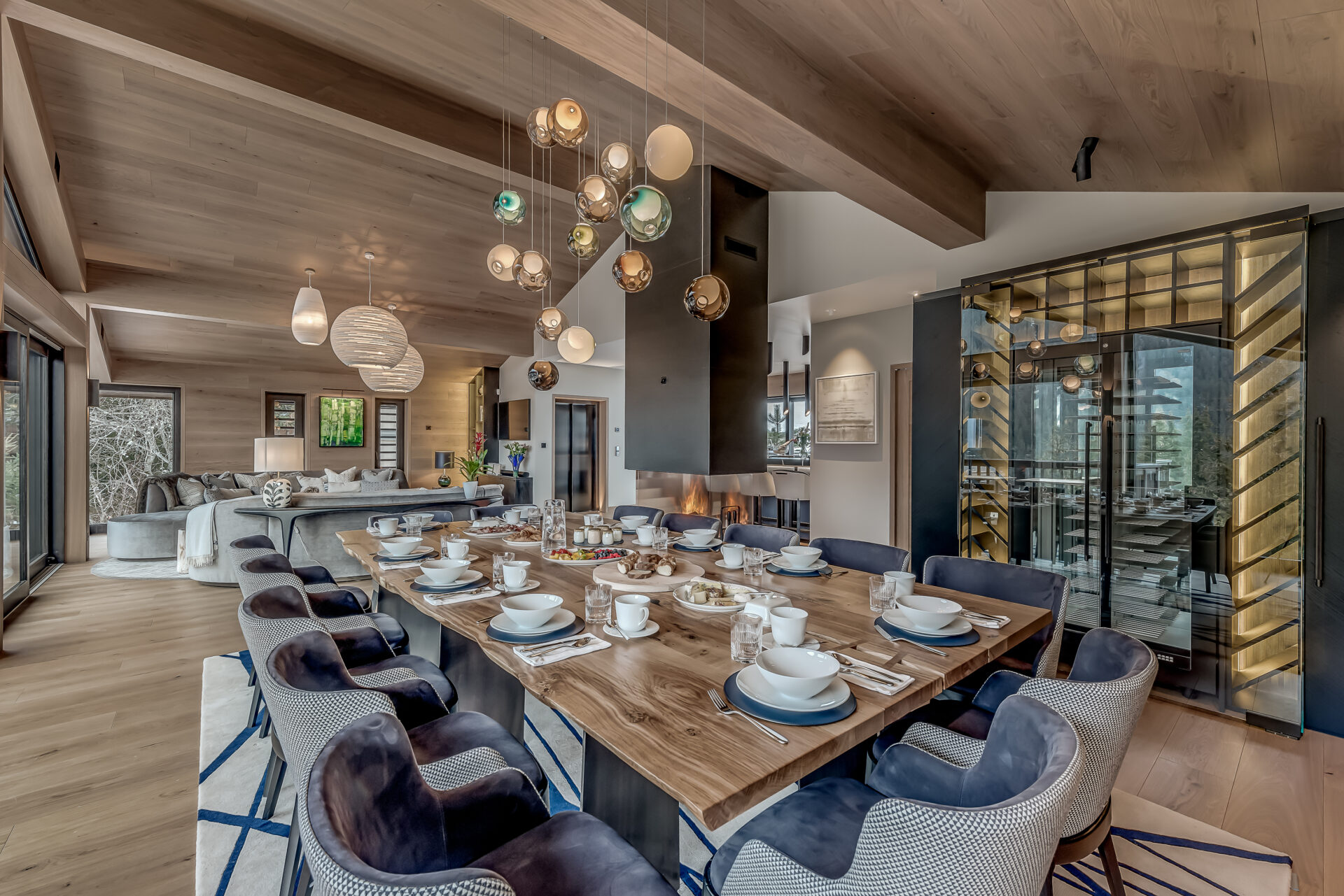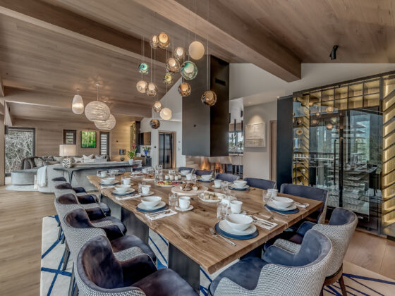 Inside, floor-to-ceiling windows frame uninterrupted views across Les Trois Vallées. A double-height living space opens into a considered dining area, where contemporary design is complemented by a striking wine cellar display. The open kitchen centres the chalet around shared moments, while a sleek bar leads onto a generous terrace, complete with an oversized hot tub overlooking the slopes.