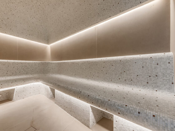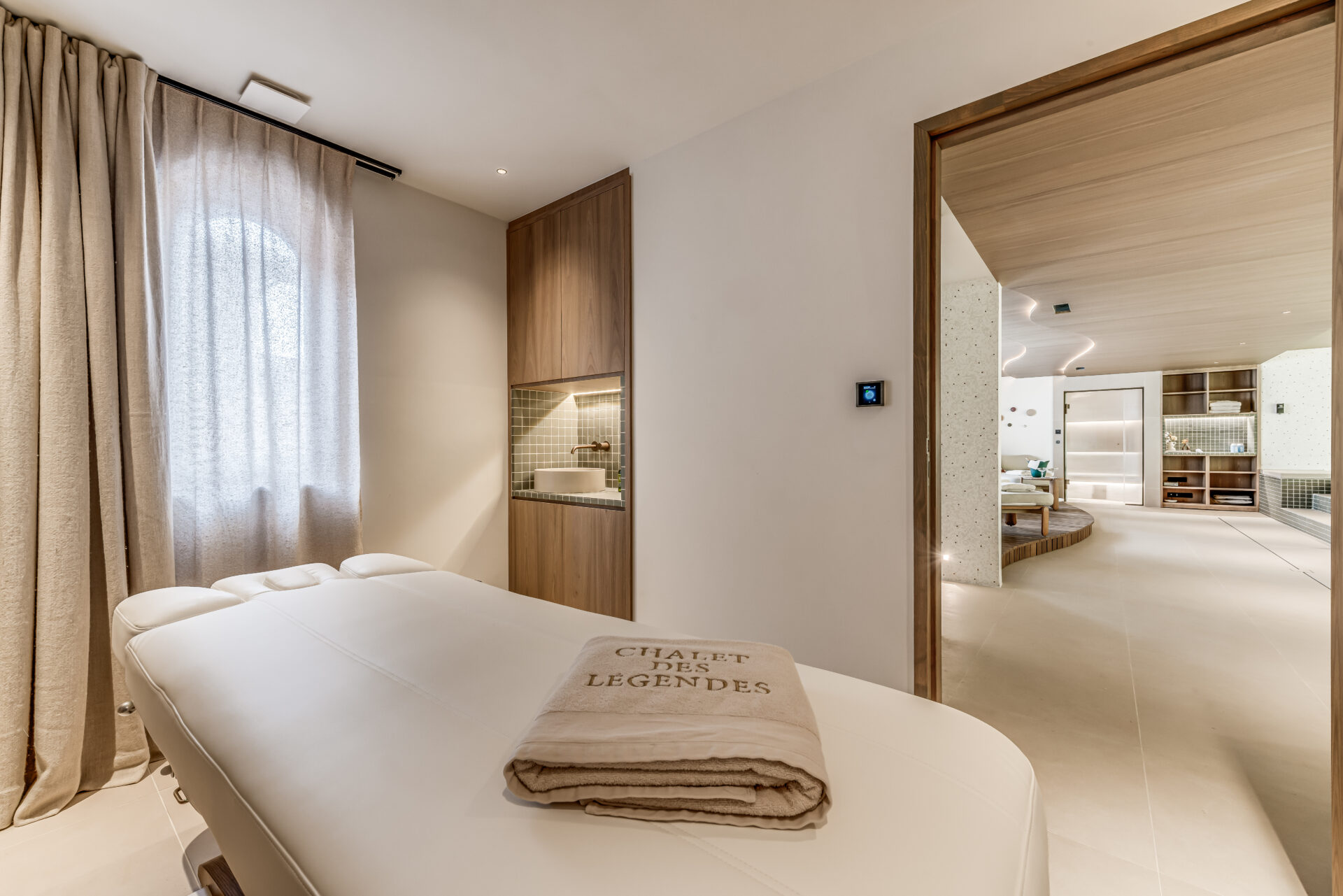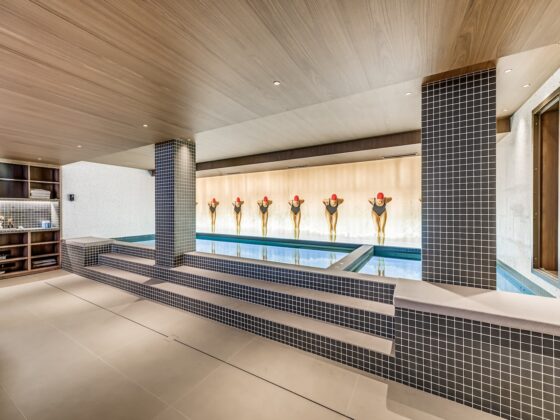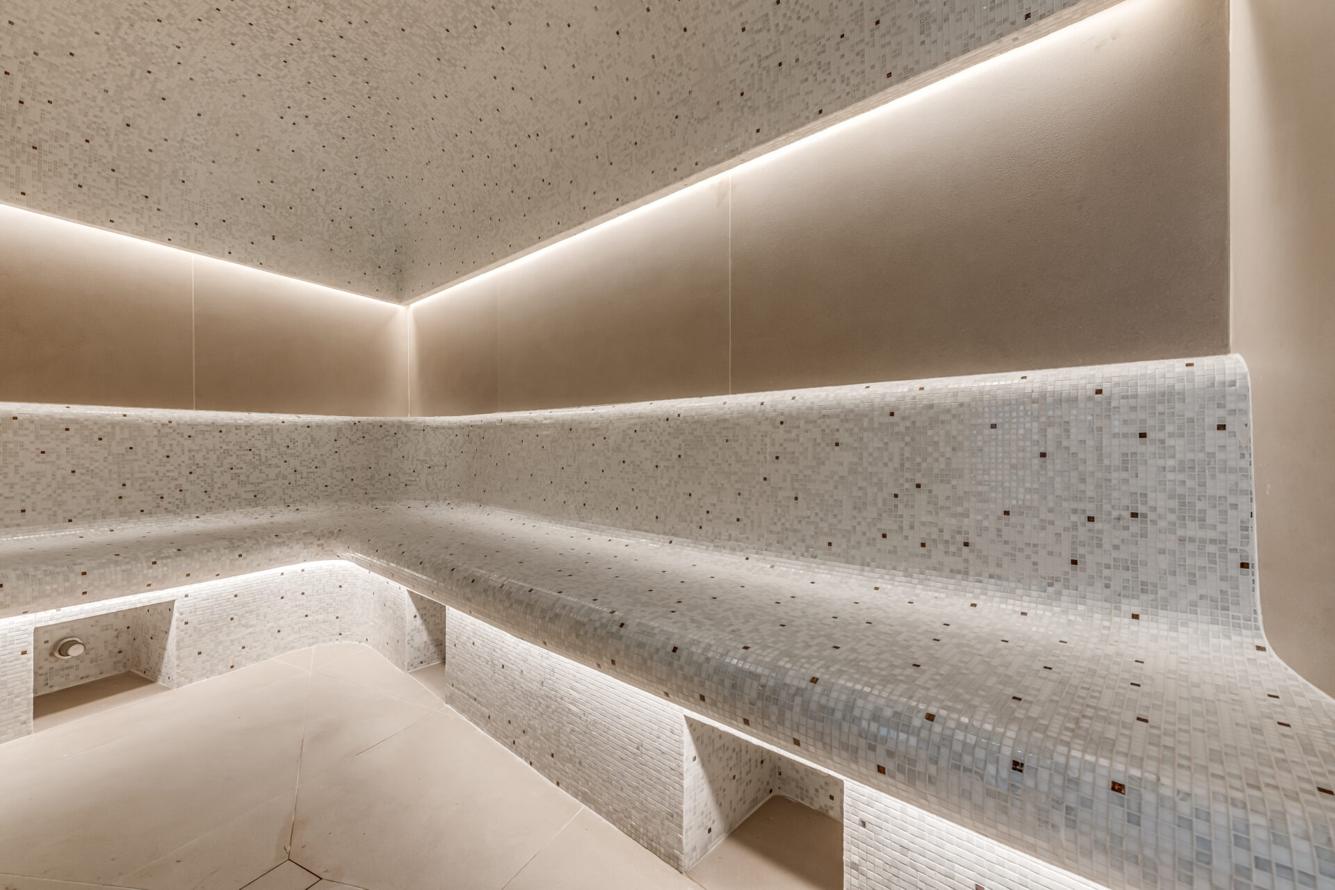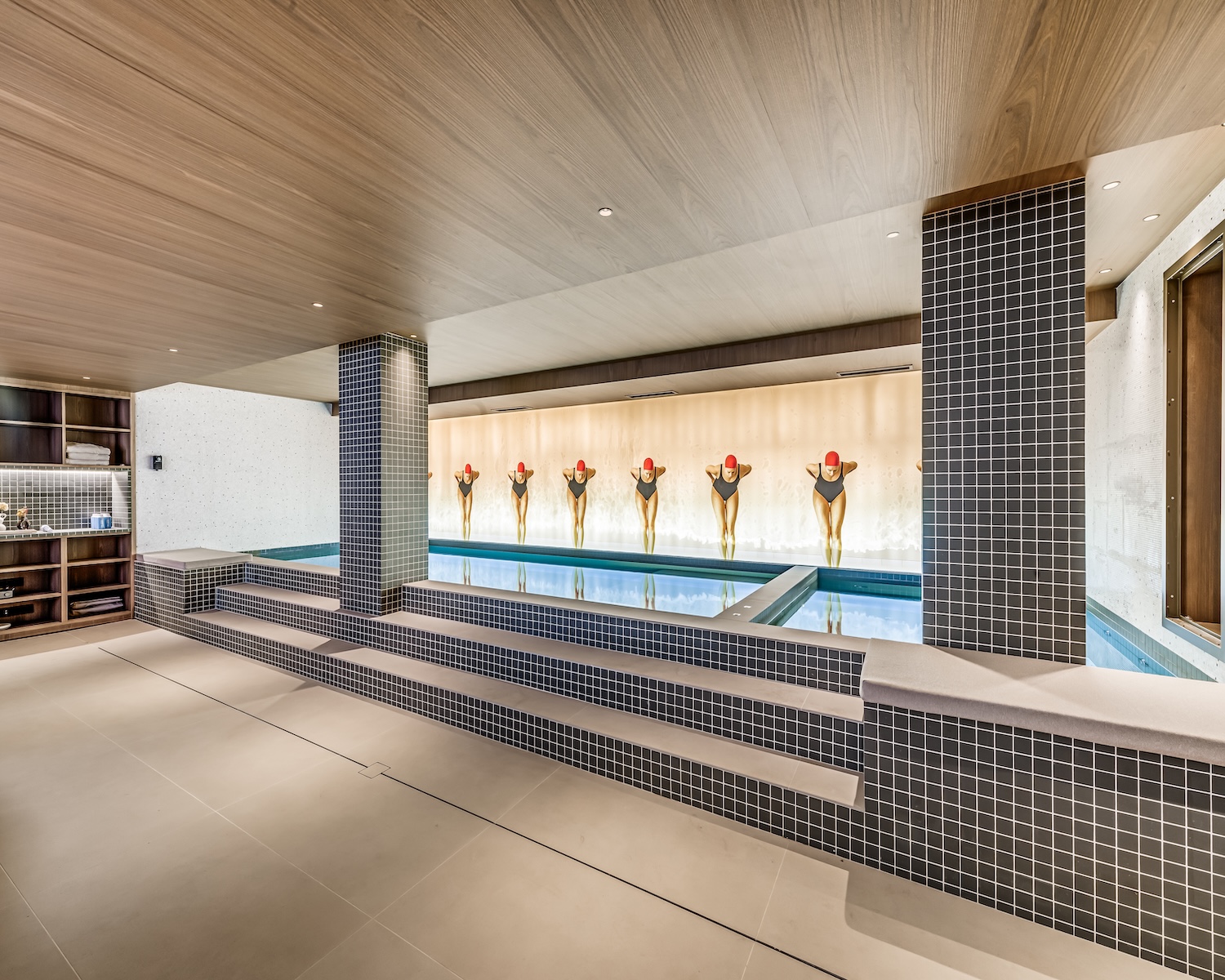 On the lower level, the focus shifts to wellness. A spacious indoor pool, hot tub and hammam create a more immersive spa environment, complemented by a private treatment room and a lounge designed for slower moments.