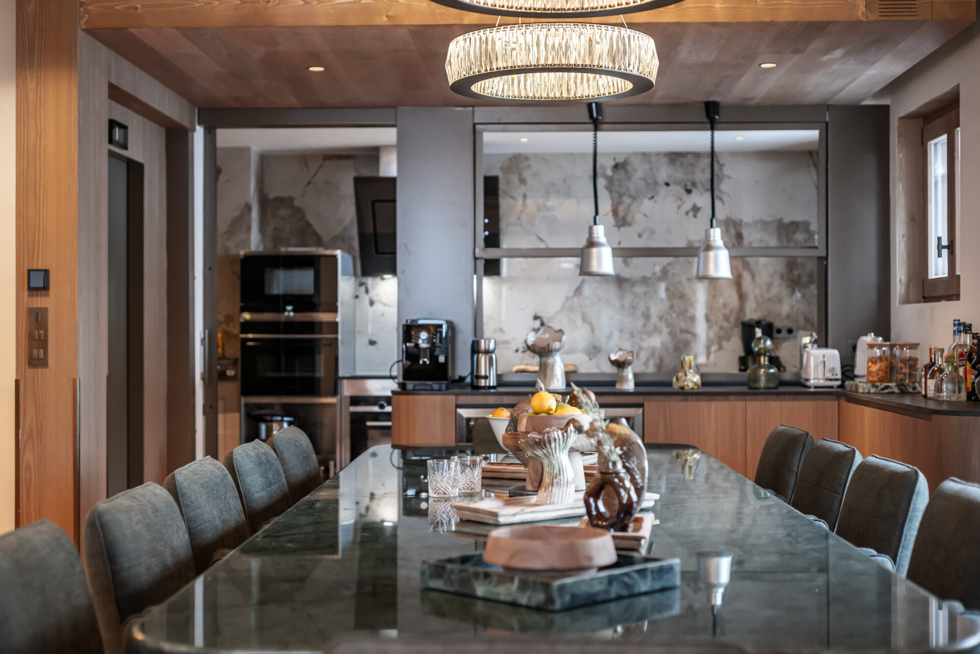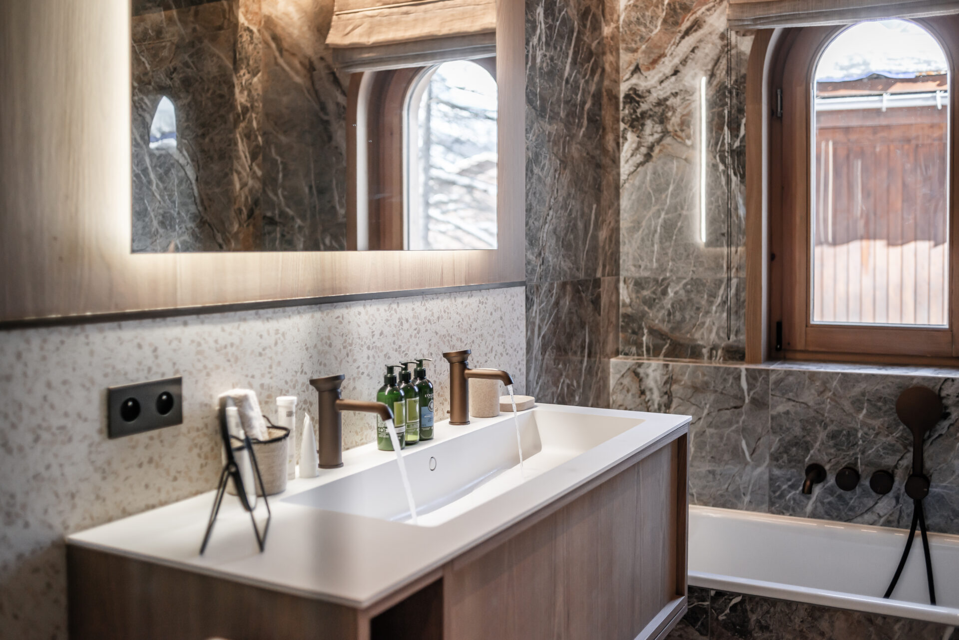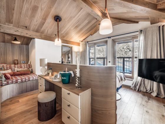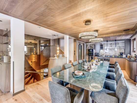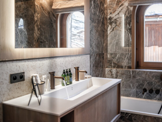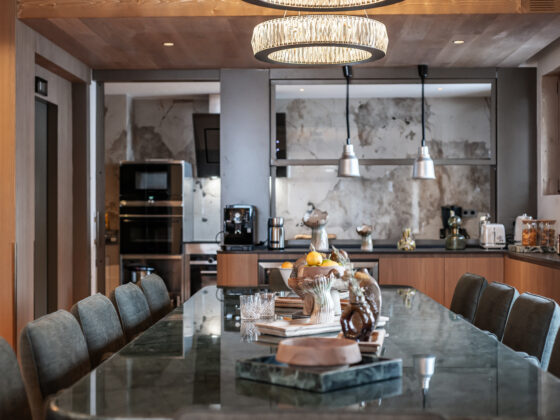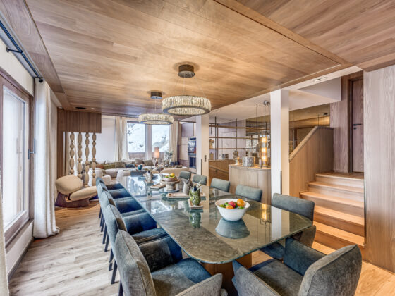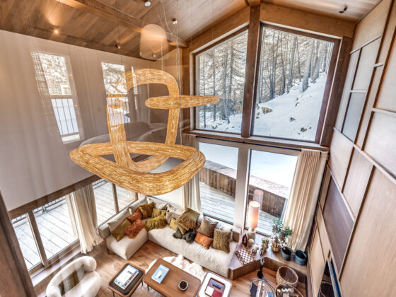 Inside, the chalet feels contemporary yet warm, where natural materials are paired with more expressive design details. Sculpted lighting, clean architectural lines and subtle references to Val d’Isère’s heritage bring a quiet sense of character without ever feeling overdone. The double-height living space centres around the fire, with views opening out across the mountains.