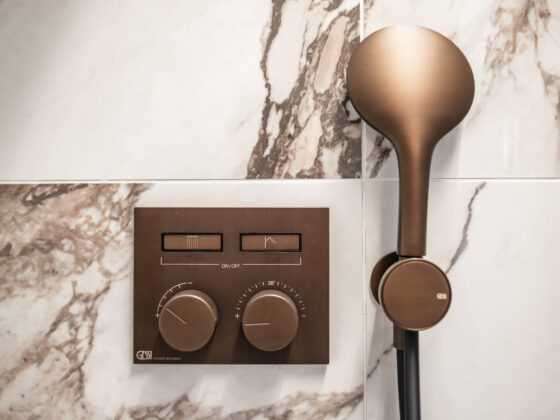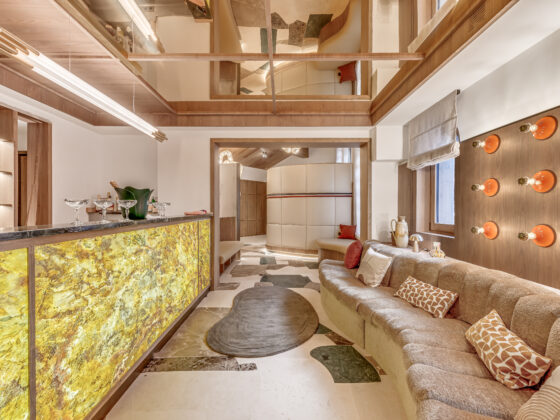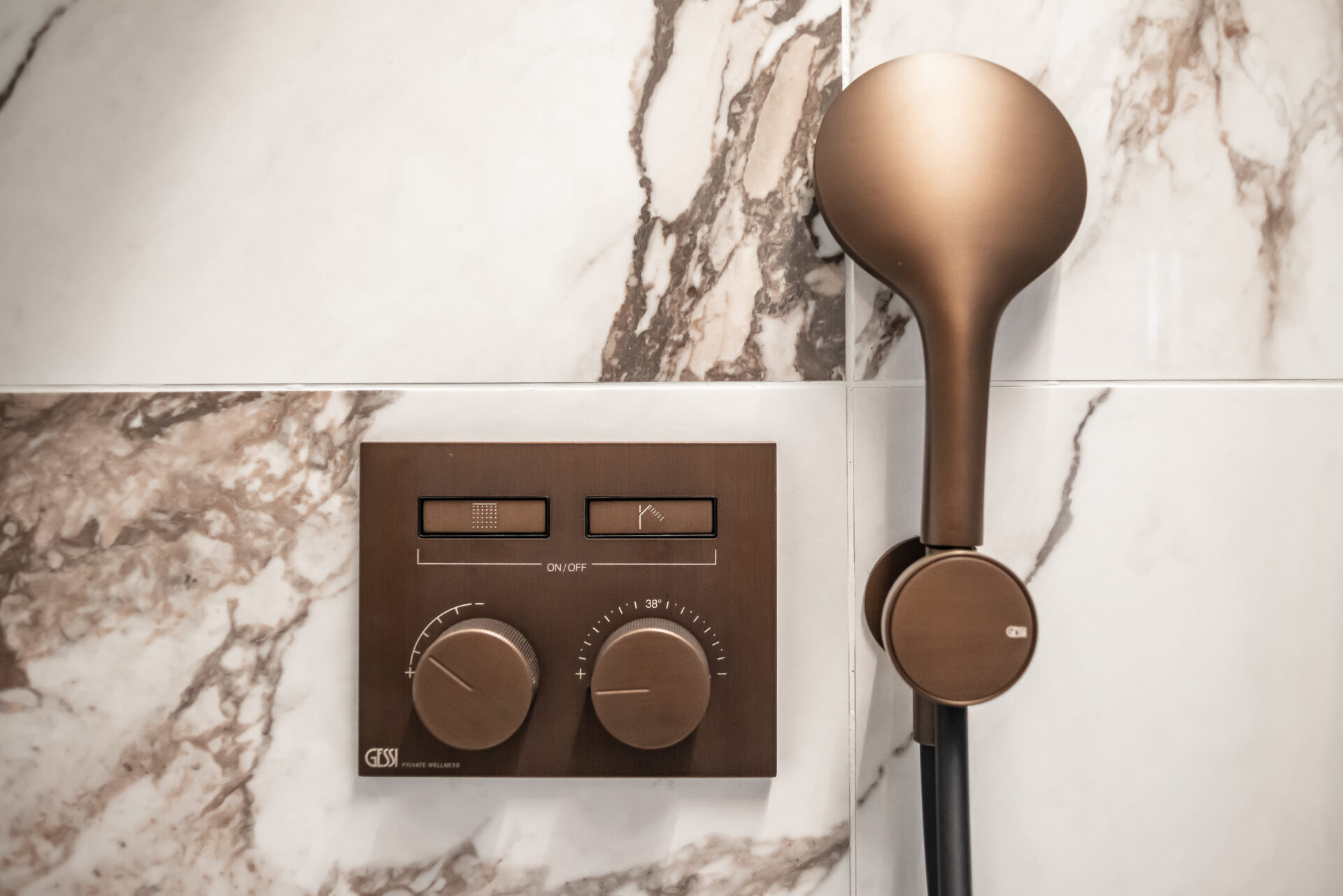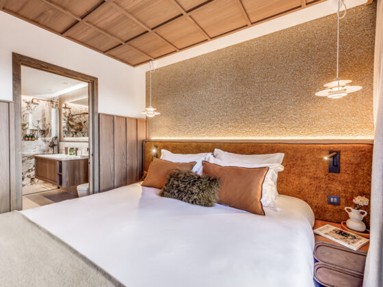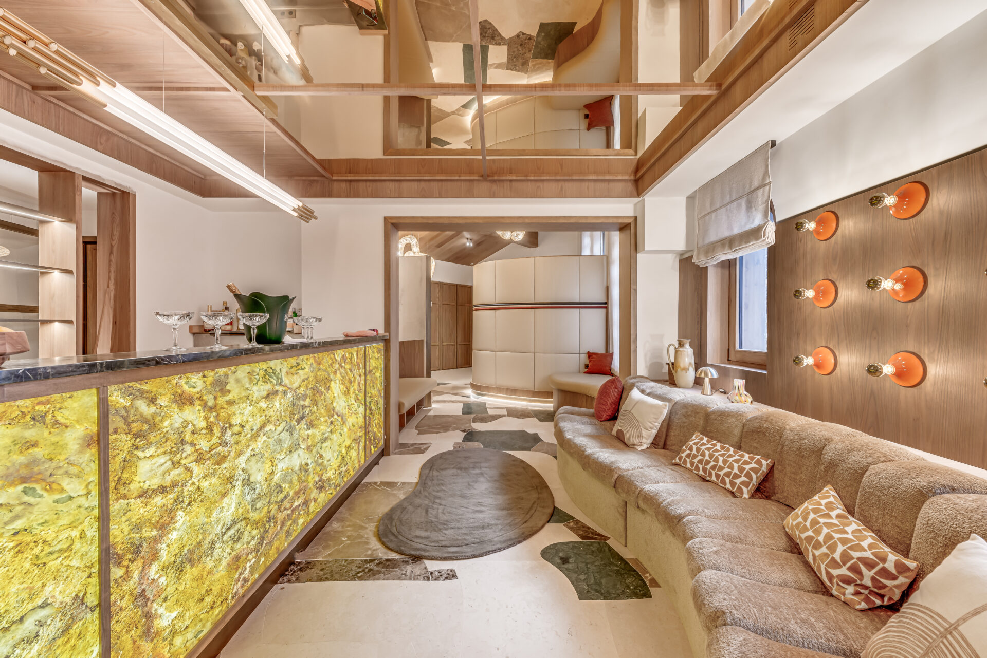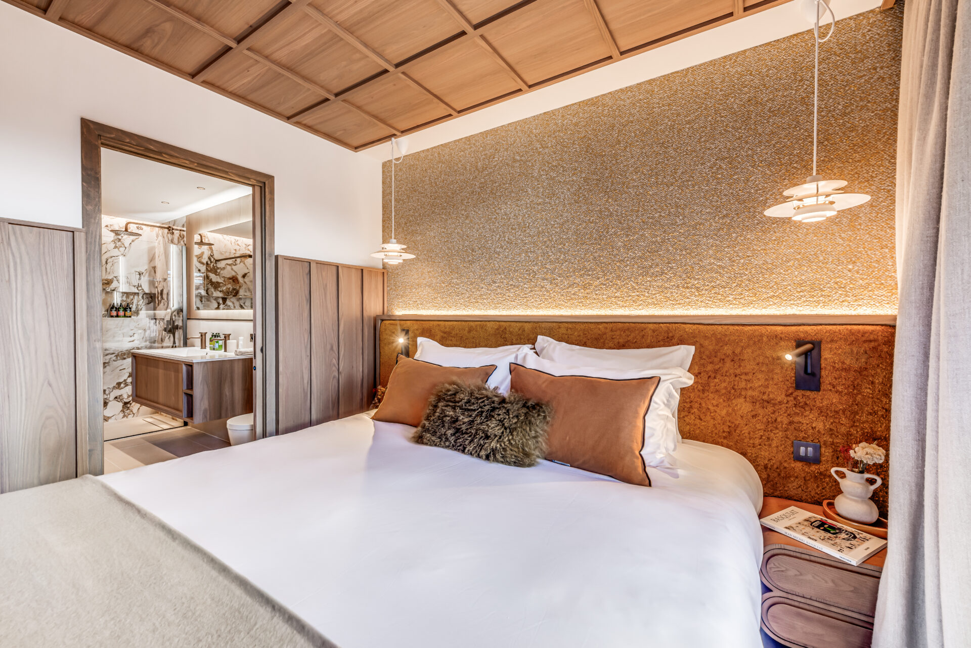Inside, the chalet feels contemporary yet warm, where natural materials are paired with more expressive design details. Sculpted lighting, clean architectural lines and subtle references to Val d’Isère’s heritage bring a quiet sense of character without ever feeling overdone. The double-height living space centres around the fire, with views opening out across the mountains.