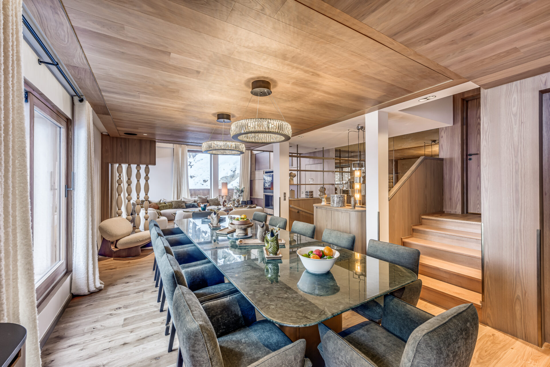 The layout is designed for both energy and ease. Open-plan living and dining flow into a fully stocked bar, where afternoons move easily into the evening. In the dedicated après-ski bar area, artwork on the walls pays a subtle nod to the figures who shaped Val d’Isère, adding a sense of place and story to the space.