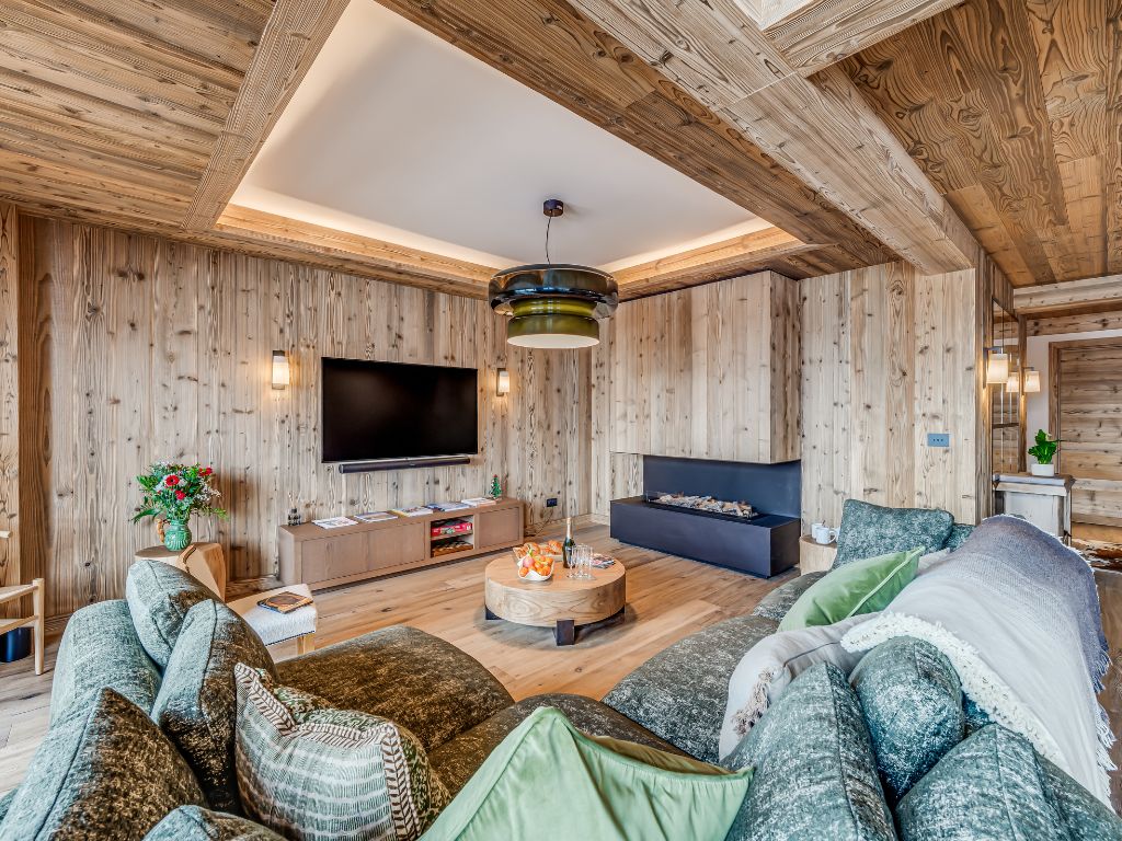 The apartment features a spacious open-plan living and dining area with plush seating and access to a private balcony and terrace, offering stunning panoramic views of the surrounding peaks. A fully equipped kitchen leads to an open-plan dining area seating 10 guests, allowing you to enjoy evening meals together. Additionally, all child-friendly equipment, such as high chairs and cots, can be arranged in advance to ensure everything is ready for your arrival. You will also find your own dedicated TV room, perfect for watching movies.