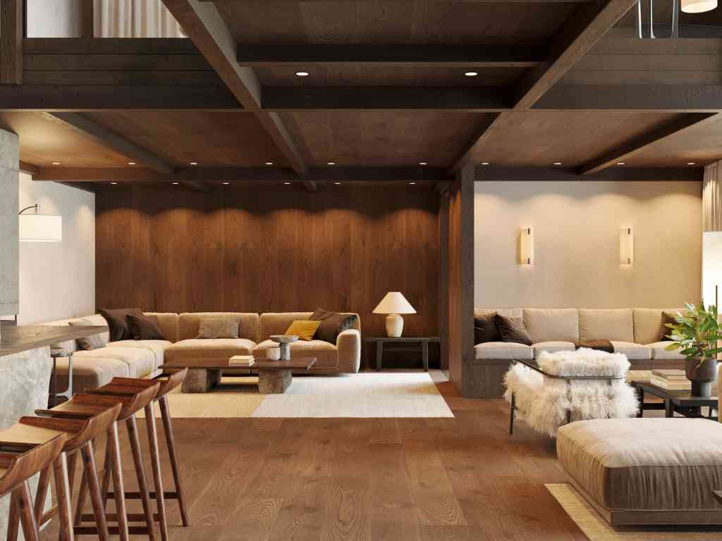 Design throughout the chalet is calm and light-filled, with a focus on modern open-plan living finished in high-quality natural materials. Warm timber, stone and concrete are layered with textured finishes and a soft, earthy palette, creating interiors that feel balanced, timeless and closely connected to nature.